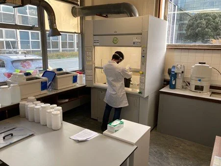 The primary mechanical processing of rock samples takes place in the UCD Crushing Room, with the aid of a jaw crusher, disc mill and sieve shaker. In this step the solid rock samples are turned from chunks of rock up to tens of centimetres in length into sand which is then sieved to isolate the fraction with a grain size between 250 and 850 µm.